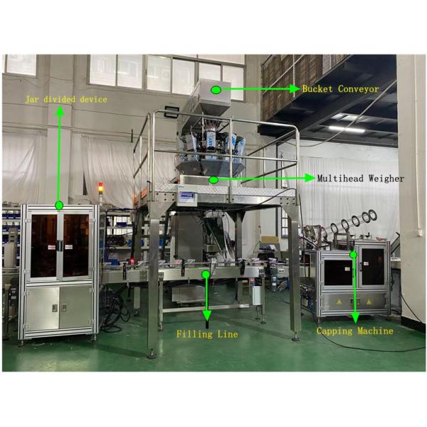 After weighing, the multihead weigher will fill the right weight of product into jar one by one